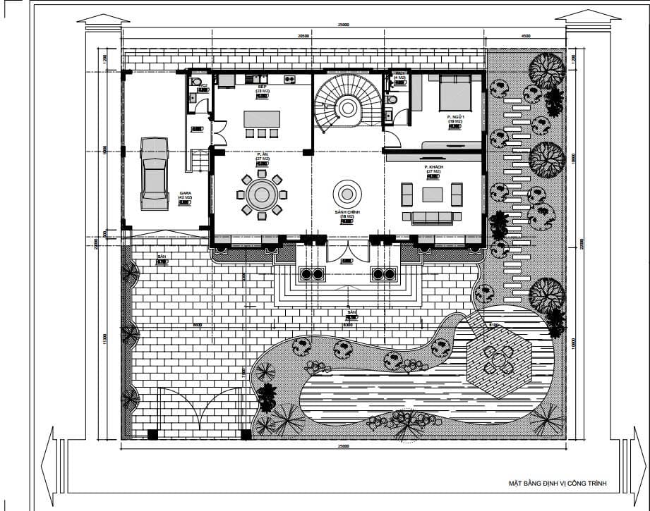 Sân vườn : Vọng lâu kết hợp hồ cá coi ,thác nước , và các đồi cỏ , cây xung quanh khuôn viên nhà .